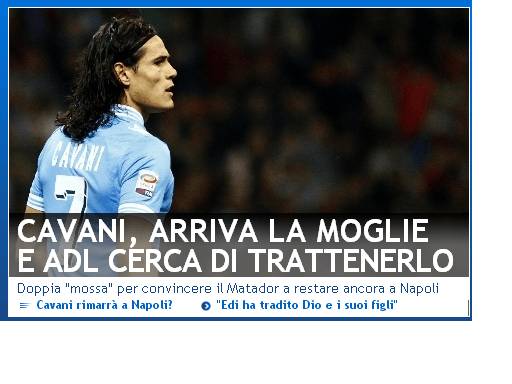 “Da una parte continua il pressing di De Laurentiis per trattenere il Matador a Napoli con la promessa di una squadra da scudetto, dall’altra la moglie Soledad torna in Italia dopo cinque mesi per mettere fine alle voci di rottura col marito. Una mossa doppia per convincere il bomber a resistere alle tentazioni Real, City e Juve: una sul fronte sportivo, l’altra su quello familiare.