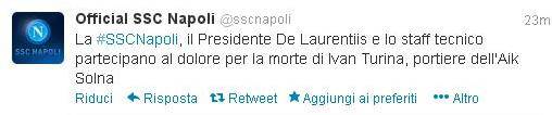 Ecco il tweet di cordoglio della SSC Napoli sul proprio profilo twitter per la brutta tragedia che ha colpito Turina, portiere dell’AIK Solna (clicca qui per leggere la news):