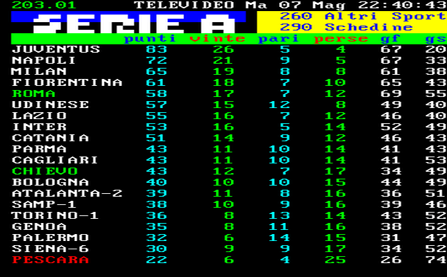 Dopo i primi due verdetti emessi tre giorni fa (scudetto alla Juve e retrocessione del Pescara), questa sera potrebbero esserci delle nuove sentenze in serie A. Anzitutto il Napoli potrebbe staccare definitivamente il pass per la Champions senza passare per i preliminari. Questi ultimi potrebbero invece toccare al Milan, in caso di passo falso della Fiorentina a Siena. La “Viola” a sua volta, vincendo, metterebbe una seria ipoteca sulla qualificazione in Europa Legue, considerato il passo falso della Roma: in questo caso le mancherebbe un punto. E se il Siena in questione perdesse, potrebbe rischiare di essere già retrocesso. Tutto dipenderà anche dalle altre gare, in particolare dal match Torino-Genoa. Il Palermo invece se la vedrà al ‘Barbera’ contro l’Udinese.