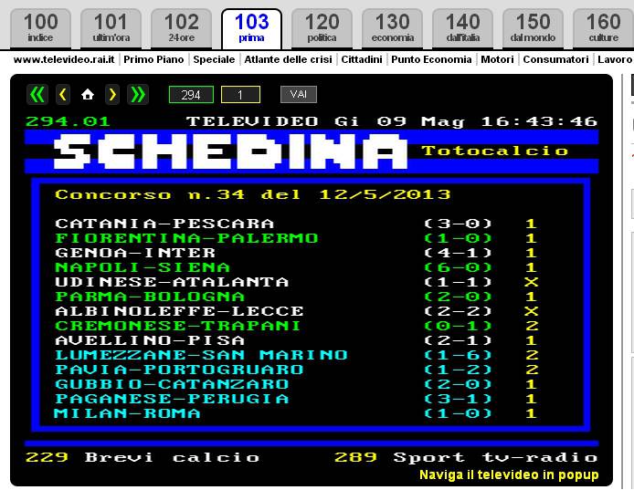 FOTO – Televideo anticipa i risultati del prossimo Totocalcio. Punteggio tennistico per il Napoli 10/05/201308/05/2013 di antoizzo Un errore di ‘Televideo‘ che riporta i risultati della prossima schedina del Totocalcio. Ecco l’incredibile foto che riporta, tra l’altro, una strepitosa vittoria del Napoli contro il Siena. A.I.