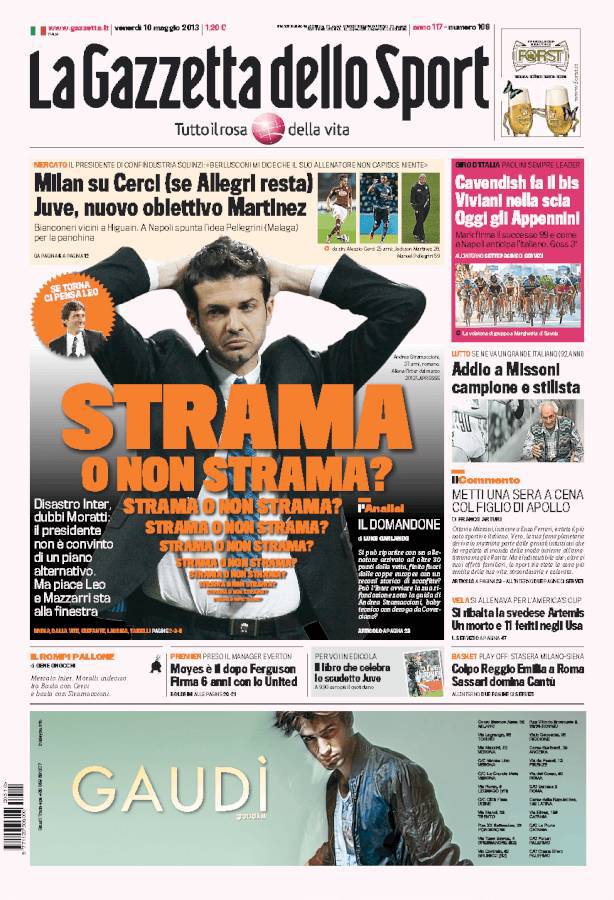 RASSEGNA STAMPA – Le prime pagine dei quotidiani sportivi 10/05/201310/05/2013 di antoizzo Intrigo Mazzarri, sospeso tra Napoli e Roma. Intanto Montella chiama il Napoli A.I.