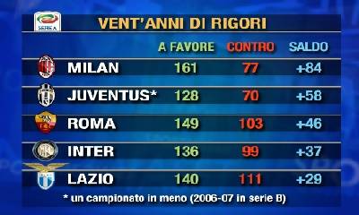 Per i dati della Juve manca ovviamente nel computo la stagione di B 2006-07: i numeri bianconeri sono comunque significativi soprattutto in fatto di rigori subiti, soltanto 70 in 19 campionati. Solo tre volte la squadra che poi ha vinto lo Scudetto ha avuto un saldo passivo: il Milan di Capello del ’94 (quello del doblete campionato-Champions), con 1 rigore a favore e 4 contro; la Juventus del primo scudetto targato Lippi del ’95 (7 rigori pro, 8 contro) e l’Inter del triplete mourinhano (6/7).