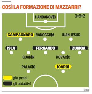 E’ ufficiale l’esonero di Stramaccioni e l’ingaggio di Mazzarri come nuovo allenatore dell’Inter per le prossime due stagioni. Il tecnico toscano ex Napoli ha già in mente la squadra del futuro, ovviamente giocherà con il 3-5-2, con Campagnaro accanto a Ranocchia e Juan Jesus. A centrocampo i due esterni che ha in mente Mazzarri saranno Isla e Zuniga, con Fernando del Porto centrocampista centrale e Guarin e Kovacic interni. Attacco con Icardi e Palacio, due pupilli di Mazzarri. Moratti spera nel ritorno ai grandi livelli dell’Inter. Formazione secondo la Gazzetta dello Sport.