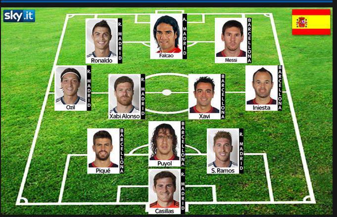 Ecco la top 11 della Liga: in campo tutti… 27/05/201327/05/2013 di vincenzomatino Nonostante il cammino in Champions League non troppo esaltante, Real Madrid e Barcellona rendono ancora la Liga uno dei campionati più affascinanti del mondo. Ecco la top 11 di quest’anno di Liga stilata da ‘Sky’: