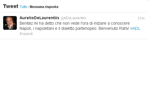 Ancora Aurelio su twitter. Dopo il grande annuncio atteso da tutta Napoli (LEGGI LA NEWS), il presidente continua a usare il social network per lanciare messaggi. Di seguito lo screen shot per annunciare cosa gli ha detto Rafa Benitez: