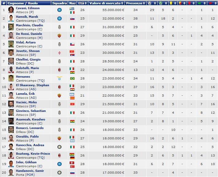 Cavani e Hamsik sono i giocatori più costosi della serie A. ‘Transfermarkt.it’ riporta uno speciale grafico che indica i maggiori valori di mercato dei calciatori di serie A, oltre alle statistiche dell’ultima stagione. Il Matador e lo slovacco hanno valgono rispettivamente 55 e 32 milioni di euro, terzo Marchisio che vale 31 milioni. Nella top 20 figura anche Gokhan Inler che vale 18 milioni.