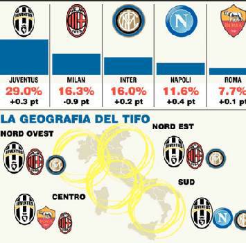 La più amata dagli italiani. La Juventus si conferma la regina del tifo: gli ultimi dati raccolti raccontano di 11,2 tifosi nella penisola (29% del totale) davanti al Milan (16,3%), Inter (16%) e Napoli (11,6%). Numeri sensazionali anche in Europa, dove i bianconeri raggiungono il cuore di 38 milioni di fan e sono al settimo posto nella classifica dominata da Barcellona e Real Madrid. Nel continente la crescita del tifo-Juve è del 9%.