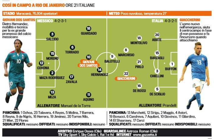 Messico-Italia, Maggio va in panchina: ecco la formazione scelta da Prandelli 16/06/2013 di vincenzomatino Christian Maggio non sarà titolare quest’oggi nell’esordio dell’Italia alla Confederation Cup contro il Messico. Cesare Prandelli sull’out destro ha intenzione di schierare Abate. Di seguito il grafico proposto dalla ‘Gazzetta dello Sport’: