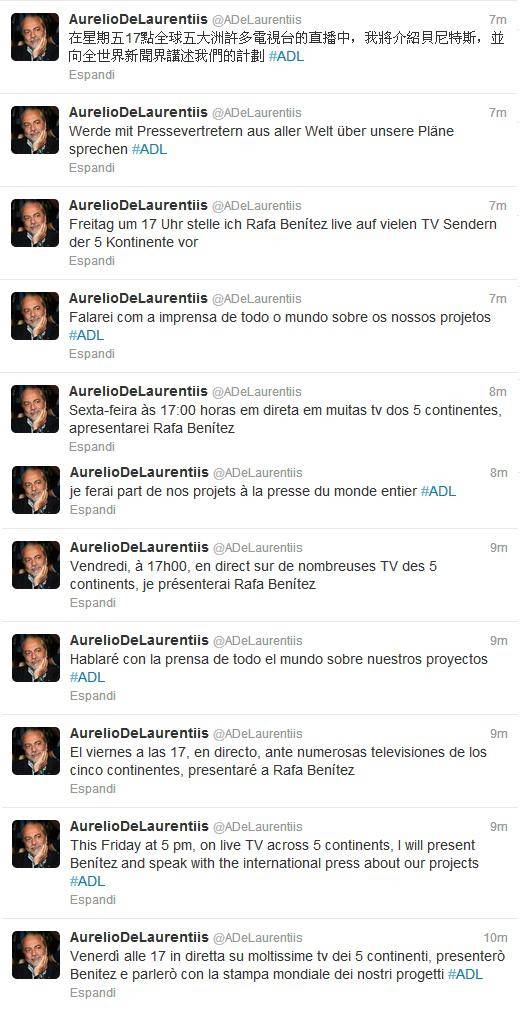 Aurelio De Laurentiis si supera. Adesso twitta in ben 7 lingue diverse, annunciando al mondo intero l’evento in programma venerdì, ovvero la presentazione di Rafa Benitez. “Venerdì alle 17 in diretta su moltissime tv dei 5 continenti, presenterò Benitez e parlerò con la stampa mondiale dei nostri progetti“. Al tweet in italiano seguono quelli di diverse lingue mondiali; un messaggio, come si vede dalla foto, che giungerà anche in Estremo Oriente.