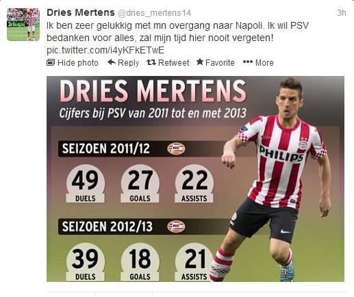 Il giocatore belga, ormai azzurro da un paio di giorni, ha colto nel pomeriggio l’occasione di ringraziare pubblicamente la sua ex squadra, il Psv, ringraziando la società per gli anni passati assieme, e lo ha fatto direttamente tramite il suo profilo ufficiale twitter.