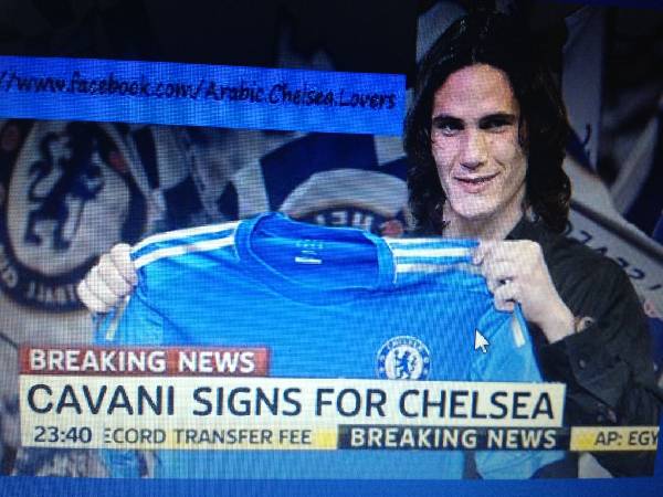 Scherzi del web o quantomeno, tentativo di anticipo di ipotetici scenari. L’ennesima trovata riguarda Edinson Cavani con una foto che circola in rete: si tratta della presentazione del Matador al Chelsea mandata in onda in tv. Questa la fantasia di alcuni tifosi arabi del Chelsea.
