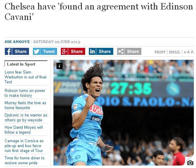 Secondo quanto riporta il portale ‘theindipendent.co.uk’ il Chelsea avrebbe trovato un accordo con Cavani. Il portale fa riferimento al tweet di un cronista Sky, Tancredi Palmeri, secondo il quale ci sono stati seri colloqui tra i blues e il Matador: “Il Chelsea ha trovato un accordo con il Napoli in termini personali, in attesa di un accordo con il Napoli“. Questo il tweet del giornalista tradotto dall’inglese, al quale aggiunge: “Controllo le mie fonti, posso confermare che il Chelsea ha avuto molti colloqui con l’entourage di Cavani negli ultimi giorni“.
