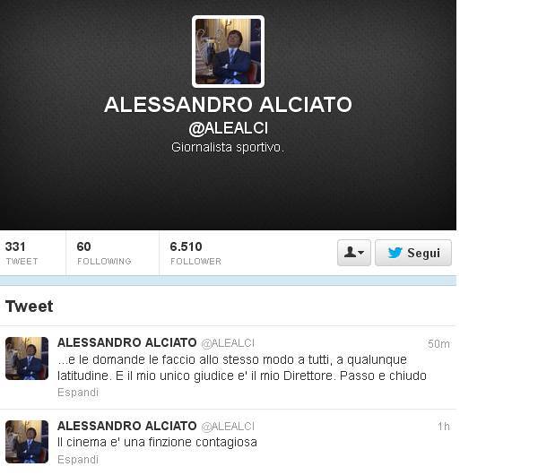 Continua la polemica tra Alessandro Alciato, giornalista di Sky, e Aurelio De Laurentiis dopo la domanda ‘incriminata’ al Matador (LEGGI LA NEWS). Ad alimentarla è il dipendente di Sky che sul proprio profilo twitter ha scritto: “Il cinema e’ una finzione contagiosa…e le domande le faccio allo stesso modo a tutti, a qualunque latitudine. E il mio unico giudice e’ il mio Direttore. Passo e chiudo”