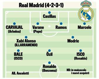 Nella testa di Florentino Perez frulla un obiettivo, un’idea fissa: con Ancelotti in panchina, bisogna assolutamente vincere la decima Champions League. Durante la presentazione ufficiale, dal tecnico ex Milan, è stato già chiarito tutto: il Real giocherà da Real Madrid. Si prevede dunque una squadra molto offensiva, pronta a schiacciare gli avversari. Il Corriere dello Sport ha provato a sbirciare nei piani di Carletto Ancelotti che starebbe studiando un 4-2-3-1 dove la fantasia avrà certamente il potere. Occhio dunque al nuovo arrivato Isco, ed al possibile colpo Bale.