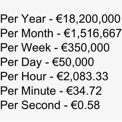 Cifre spaventose quelle che riguardano il nuovo ingaggio di Edinson Cavani al Psg. Dopo aver reso l’idea di tutte le voci incluse nel suo contratto, tra bonus e diritti d’immagine (LEGGI IL GRAFICO DEL CONTRATTO DI CAVANI), i media inglesi fanno un rapido e semplice calcolo di quanto il Matador guadagnerà ogni secondo, minuto, ora, settimana e così via…