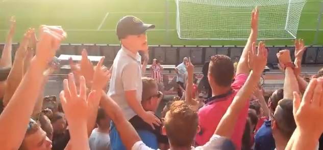 Abbastanza piccolo da dover stare sulle spalle del padre per vedere la partita, ma non così giovane da non poter guidare ii sostenitori del Psv Eindhoven: a comandare i cori della Curva del club olandese è, infatti, un bambino di circa dieci anni con tutti i fan del PSV che seguono le sue indicazioni.