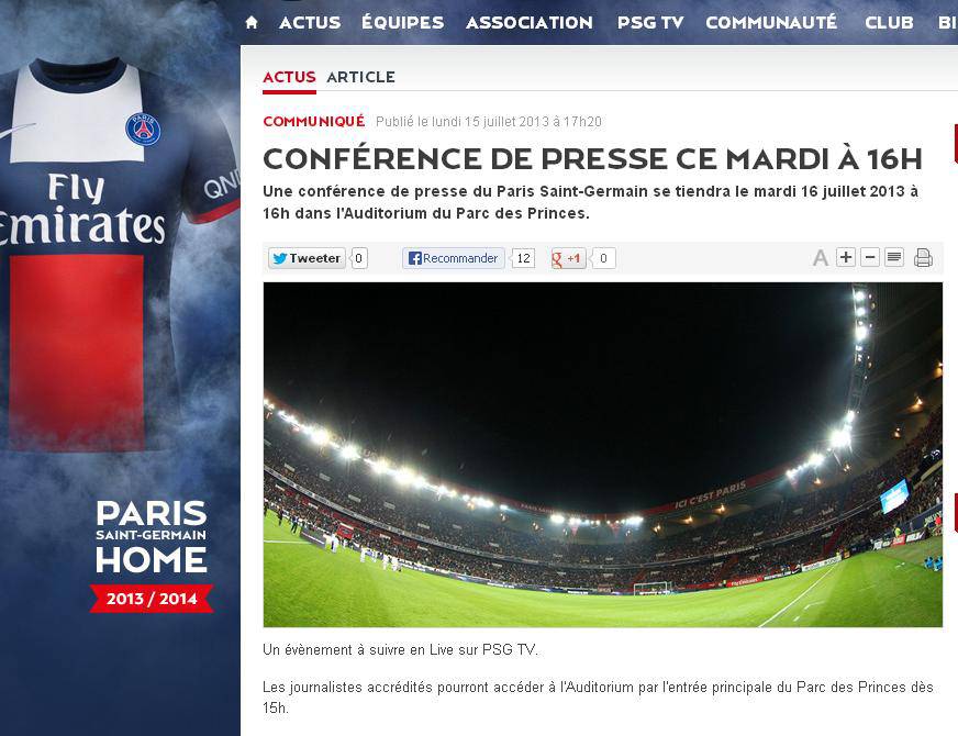 FOTO – L’annuncio del PSG: “Convocata conferenza stampa per domani” 15/07/2013 di vincenzomatino Secondo quanto si legge sul sito del PSG, domani sarà indetta una conferenza stampa alle 16 al Parco dei Principi. Sarà con ogni probabilità presentato il nuovo acquisto Cavani:
