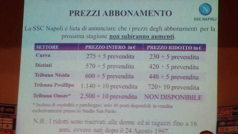 Il Napoli ha dato ufficialmente il via alla nuova campagna abbonamenti. Nel teatro comunale di Dimaro sono stati illustrati i prezzi devi vari settori. Ecco la foto: