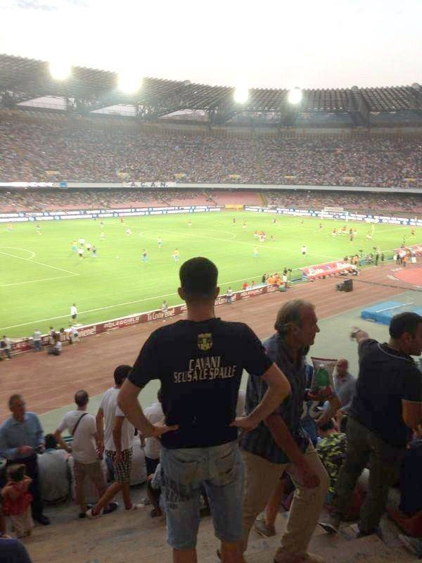 FOTO – Al San Paolo c’è chi pensa ancora a Cavani: ecco una maglia contro il Matador 01/08/201329/07/2013 di antoizzo C’è chi ancora pensa al Cavani al San Paolo. E’ il caso di questo tifoso azzurro che è andato allo stadio con una maglia anti-Matador: “Cavani, scusa le spalle”, recita il messaggio sul retro della t-shirt. Ecco la foto tratta dal web A.I.