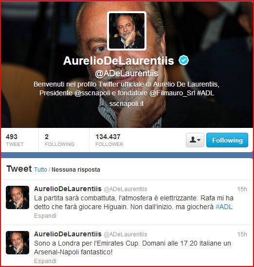 Intanto ecco lo screen shot del profilo twitter di De Laurentiis