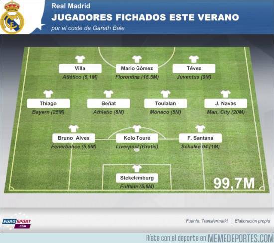 Gareth Bale si candida a diventare il giocatore più caro mai acquistato da un club: il Real Madrid è infatti pronto a sborsare una cifra vicina ai 100 milioni di euro per portare il gallese in Spagna. Con questi soldi sarebbe però possibile costruire un’intera squadra di undici elementi davvero di primo livello. Come si vede in foto, questo 3-4-3, è formato da giocatori acquistati da vari club durante il calciomercato in corso. E il costo sommato di tutti, più o meno, sarebbe pari a quello che il Real sta per sborsare per Bale.