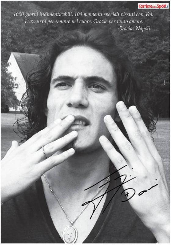 Proprio nel fine settimana che segnerà ufficialmente l’inizio della sua avventura al Paris Saint Germain (questa sera i parigini esordiranno in campionato a Montpellier, ma Cavani dovrebbe partire dalla panchina), l’attaccante uruguaiano manda un messaggio ai tifosi del Napoli, direttamente con una pagina del Corriere dello Sport.