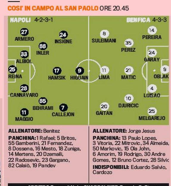 NAPOLI 4-2-3-1 – Reina; Maggio, Cannavaro, Albiol, Armero; Behrami, Inler; Callejon, Hamsik, Insigne, Higuain All. Benitez