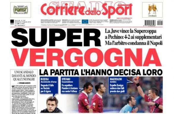 Amara ricorrenza per i tifosi partenopei. E’ passato ormai un anno, ma la delusione per l’ennesimo atto di ingiustizia avvenuto nella scorsa edizione di Supercoppa italiana non è stato dimenticato dai tifosi del Napoli, penalizzati da un arbitraggio a dir poco inadeguato, che permise alla Juve di vincere immeritatamente il trofeo. Era l’undici agosto 2012 e a Pechino, dinanzi agli occhi dell’intero mondo (erano molteplici le televisioni collegate da svariate parti del pianeta), si consumò la tragedia sportiva: il Napoli si arrese agli avversari ma soprattutto ad una direzione di gara nettamente a favore della Juventus, la quale vinse, dopo i tempi supplementari, 4 a 2. Inevitabile la rabbia di De Laurentiis che decise, insieme alla squadra, di non partecipare alla cerimonia di premiazione. Come già accennato, è una ferita difficilmente rimarginabile e sono ancora tanti i tifosi partenopei che sul web ricordano con orrore e rabbia quella giornata. Ecco come titolava il ‘Corriere dello Sport’ il giorno seguente: