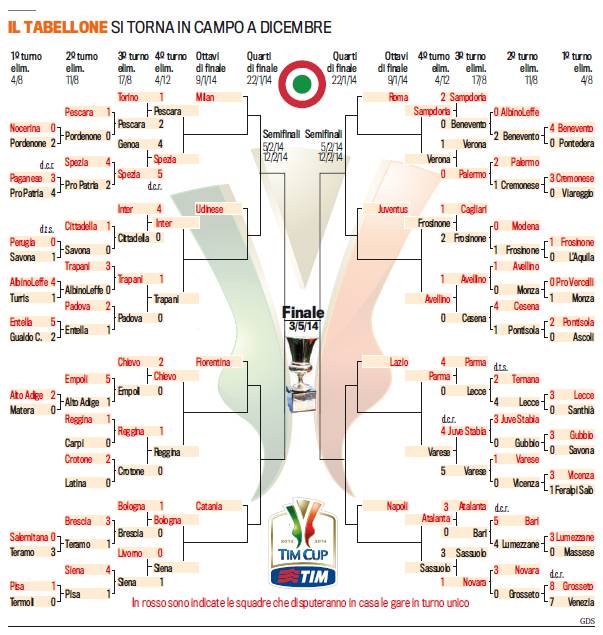 Ecco il tabellone della Tim Cup 2013-2014 dopo il completamento del quarto turno. Il 4 dicembre si tornerà in campo come segue: Spezia-Pescara, Inter-Trapani, Chievo-Reggina, Bologna-Siena, Sampdoria-Verona, Avellino-Frosinone, Parma-Varese, Atalanta-Sassuolo. Si ricorda che il Napoli, così come la Juventus, il Milan, la Fiorentina, l’Udinese, il Catania e le due romane, parteciperà direttamente agli ottavi di finale il 9 gennaio. Gli azzurri, nel dettaglio, sfideranno la vincente di Atalanta-Sassuolo.