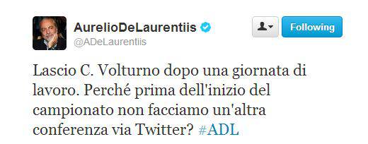 FOTO – De Laurentiis via Twitter: “Ho una proposta per tutti i tifosi per l’inizio del campionato” 21/08/2013 di Antonio Papa Il patron azzurro Aurelio De Laurentiis ha appena pubblicato un messaggio sul suo profilo Twitter ufficiale, rivolgendo una proposta a tutti i tifosi: