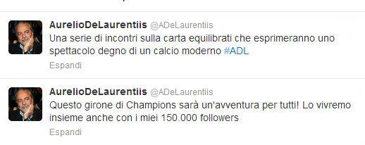 Il presidente del Napoli, Aurelio De Laurentiis, commenta l’esito del sorteggio di Champions League attraverso il suo profilo Twitter: