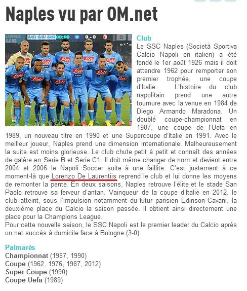 Tra le avversarie del girone di Champions del Napoli ci sarà anche il Marsiglia. Poco dopo il sorteggio di Montecarlo, sul sito ufficiale del club francese è apparso un articolo in cui Aurelio De Laurentiis è stato ‘trasformato’ in Lorenzo De Laurentiis. La confusione deriva forse dal nome del Talento di Frattamaggiore, Lorenzo Insigne. Ecco la foto: