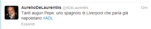 Come è solito fare, il presidente De Laurentiis lascia gli auguri su twitter ai suoi azzurri. In occasione del compleanno di Pepe Reina, il patron ha cinguettato: “Tanti auguri Pepe, uno spagnolo di Liverpool che parla già napoletano #ADL”