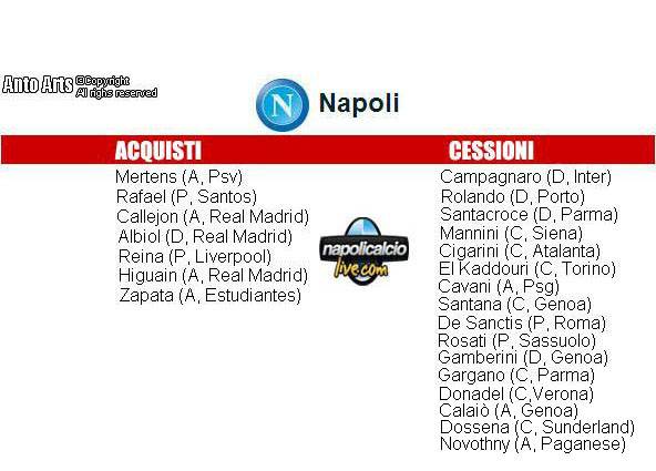 Tante operazioni in uscita per il Napoli, ben quattro nell’ultima giornata di mercato, sette quelle totali in entrata. Si chiude così la lunga sessione estiva degli azzurri, tra botti, occasioni mancate e rosa sfoltita. Il Napoli è stato capace di rimpiazzare il giocatore più importante della scorsa stagione, Edinson Cavani, con il colpo Higuaìn; ha comprato i trequartisti adatti al modulo di Benitez, due nuovi portieri, Zapata e Albiol. Tuttavia la piazza si aspettava qualcosa in più: almeno un altro centrocampista, visto che a parte i tre svizzeri, c’è il giovane Radosevic, e almeno un altro difensore, soprattutto dopo le pecche rivelate nell’ultima giornata. Invece si va avanti così, questa la scelta della società che d’altro canto ha avuto il merito di sfoltire la rosa. Emblematica la cessione all’ultimo minuto disponibile di Dossena e soprattutto di Donadel che ormai era diventato un caso quasi irrisolvibile. Il Napoli si libera del giocatore ma non dell’ingaggio: secondo le ultime indiscrezioni infatti sarà la stessa società azzurra a pagare l’ingaggio al centrocampista.