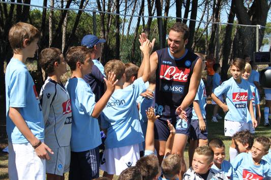 Gonzalo Higuaín come non lo avete mai visto. L’attaccante argentino è stato il grande protagonista della seconda edizione dello ‘Junior Summer Camp‘ dell’SSCNapoli. Nella giornata di ieri, l’ex ‘galactico’ ed il portiere Rafael hanno passato qualche ora in compagnia di 450 baby tifosi azzurri, posando per foto e firmando autografi e dediche, bissando così la festa di martedì mattina, cui avevano preso parte Rafa Benítez e José María Callejón. Con loro, presenti anche il vice presidente Edoardo De Laurentiis, il responsabile del settore tecnico Gianluca Grava e tutti gli istruttori delle 6 settimane di campus estivo in cui i bimbi hanno avuto l’opportunità di allenarsi sui campi di Castel Volturno, provando l’emozione del terreno di gioco calcato da Hamšík e compagni. A fine allenamento Higuaín e Rafael hanno consegnato i diplomi personalizzati ai ragazzini che hanno concluso lo scorso 21 luglio il campus estivo: un grande progetto educativo per i giovani che intendono praticare il calcio e crescere con i valori sani dello sport, perfezionando le abilità motorie e le conoscenze tecnico-tattiche e trascorrendo una meravigliosa esperienza con i propri beniamini