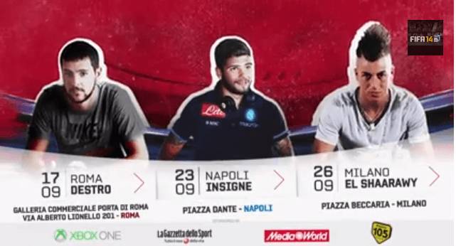 Insigne, Destro ed El Shaarawy sono stati scelti come testimonial al tour europeo organizzato da EA SPORT per promuovere il famoso videogioco ‘Fifa 14’. Il ‘Magnifico’ sarà protagonista a Piazza Dante il prossimo 23 settembre; Destro sarà invece presente nella Galleria Commerciale Porta di Roma il 17 settembre; il ‘Faraone infine a Piazza Beccaria a Milano il 26 settembre.