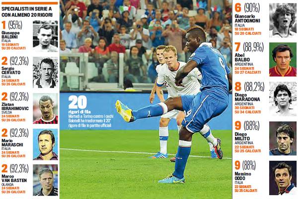 Mario Balotelli non solo è un grandissimo giocatore di movimento ma è anche un rigorista infallibile. Per adesso, su 20 calci di rigore tirati, tutti, e ripetiamo tutti, sono entrati in rete. Uno score realizzativo del 100%. Superiore addirittura a mostri sacri del pallone come Ibrahimovic, Van Basten e Maradona. Come si vede dalla foto, tratta dal La Gazzetta dello Sport, Giuseppe Baldini è il giocatore con la percentuale di rigori trasformati più alta dopo Mario: 19 su 20 e quindi 95%. Van Basten si ferma al secondo posto con il 92,3 % assieme ad un altro ex Milan: Zlatan Ibrahimovic. Maradona si trova invece all’ottavo posto con 30 calci di rigori realizzati su 34 tirati. Altri due nomi recenti sono quelli di Milito, nono con l’88% e Oddo, anche lui nella stessa posizione del Principe.