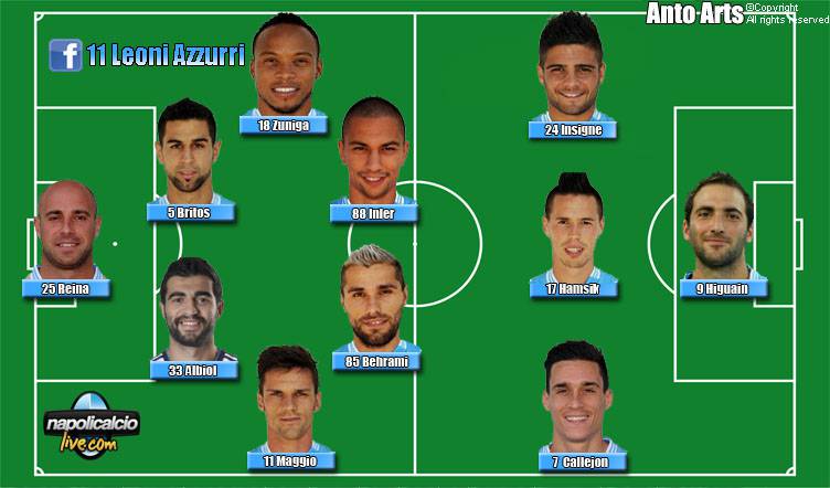 NAPOLI (4-2-3-1): Reina; Maggio, Albiol, Britos, Zuniga; Behrami, Inler; Callejon, Hamsik, Pandev; Higuain. A disposizione: Rafael, Cannavaro, Armero, Dzemaili, Insigne, Mertens. Allenatore: Benitez.