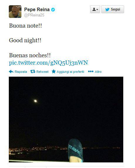 FOTO – Reina azzurro dalla testa ai ‘piedi’: guardate cos’ha pubblicato su Twitter 24/09/2013 di Antonio Papa Ecco la foto tratta dal profilo personale del portiere azzurro: