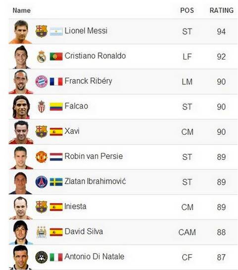 L’atteso, nuovo capitolo della saga targata EA Sports, vede in prima posizione la presenza di Lionel Messi, asso del Barcellona con un valore di ben 94 su 100, seguito da Cristiano Ronaldo (92) e dalla stella del Bayern Monaco e della nazionale francese, Ribery (90).