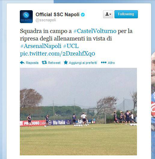 FOTO – Castel Volturno, squadra in campo per la ripresa degli allenamenti in vista dell’Arsenal 29/09/2013 di Antonio Papa A seguire, il messaggio pubblicato dall’SSCNapoli sul profilo Twitter ufficiale della società:
