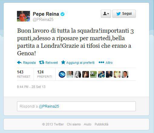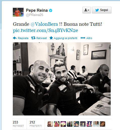 FOTO – Reina: “Grazie ai tifosi a Genova, a Londrà sarà bello”, poi il messaggio a cena con Behrami e Cannavaro 29/09/2013 di Antonio Papa A seguire, i messaggi pubblicati dal portiere azzurro sul suo profilo Twitter ufficiale :