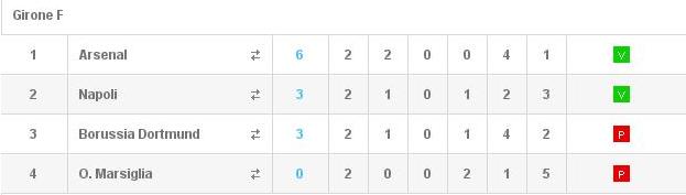 FOTO CLASSIFICA – Notte amara per il Napoli, Borussia a valanga sul Marsiglia. Comanda l’Arsenal! 02/10/201302/10/2013 di Mario D'Amiano Notte da incubo per il Napoli. I partenopei tornano a Londra dopo due anni e rimediano un’altra sconfitta amara, questa volta 2 a 0 contro l’Arsenal. Il Borussia Dortmund ne approfitta e stravince 3 a 0 contro il Marsiglia. Foto Corriere dello Sport