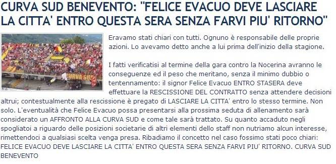 Momenti di tensione al termine del derby campano Benevento-Nocerina (Prima divisione), vinto dai padroni di casa per 1-0. A scatenare la rabbia dei tifosi del Benevento – riportè stato il gesto del loro capitano, Felice Evacuo, che si è recato sotto la curva occupata da alcune centinaia di supporter della Nocerina, sua ex squadra, per salutarli.