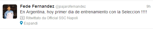Federico Fernandez è volato in Argentina per le due gare di qualificazione della sua nazionale, prima contro il Perù, poi contro l’Uruguay. Ecco il suo tweet: “In Argentina, oggi primo giorno di allenamento con la Nazionale!”