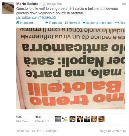 Mario Balotelli contro la Gazzetta dello Sport. L’attaccante del Milan ha risposto ad un articolo del giornale in merito alla scelta restare aggregato al gruppo in arrivo a Napoli: “Balotelli simbolo anticamorra” scrive il quotidiano riferendosi all’iniziativa della Nazionale con l’allenamento a Quarto. L’attaccante, attraverso il proprio profilo twitter ha così allegato la foto dell’articolo e cinguettato: “Questo lo dite voi! Io vengo perché il calcio e bello e tutti devono giovarlo dove vogliono e poi c’è la partita!!!!”