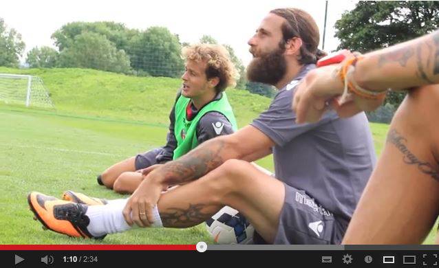 Simpatica gara di punizioni tra tre calciatori del Bologna: si tratta dello specialista Diamanti, di Kone e di Moscardelli, l’idolo del web. Tra un tiro e l’altro i tre non perdono occasioni di prendersi in giro anche con espressioni colorite.