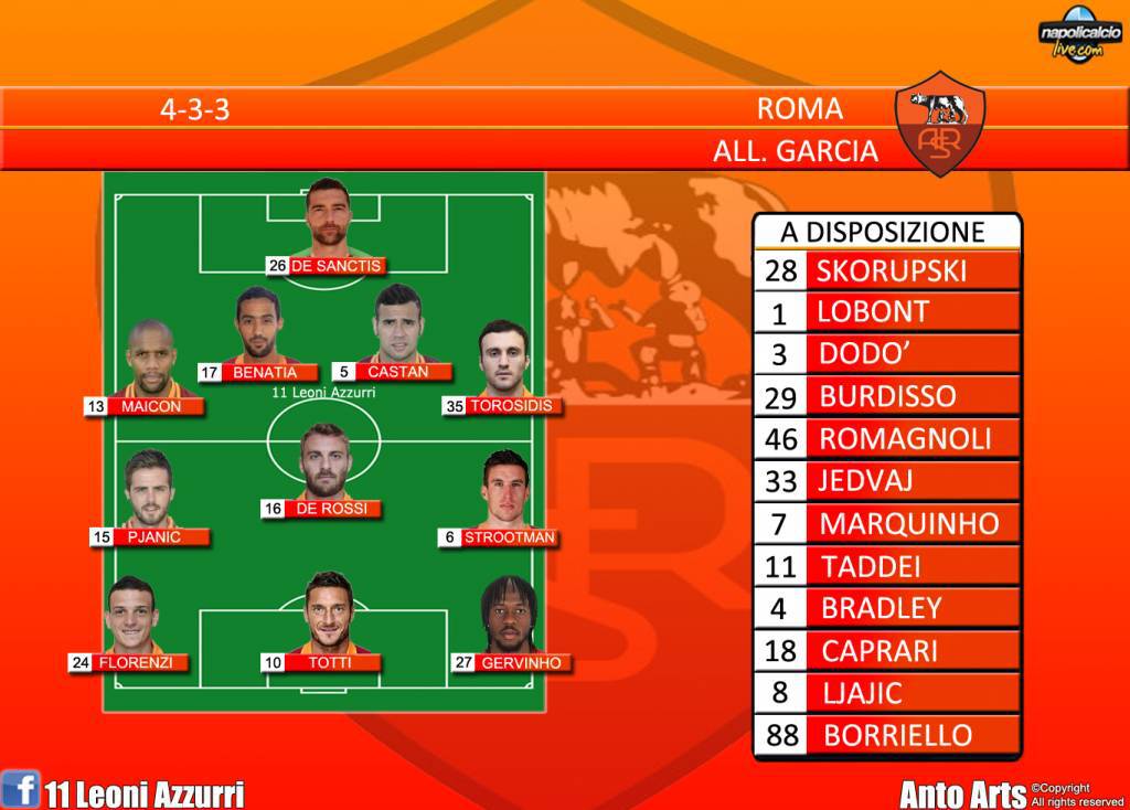 Nella Roma, invece, Maicon ha recuperato dall’infortunio e scenderà in campo regolarmente, mentre Torosidis sostituirà Balzaretti sulla sinistra. Confermato l’attacco prolifico Florenzi, Totti, Gervinho.