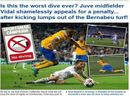 Farà ancora discutere la caduta in area di Vidal (CLICCA QUI PER GUARDARE IL VIDEO DELL’AZIONE DI VIDAL) ma intanto sul web impazzano i fotomontaggi che si fanno beffe del centrocampista della Juve. Addirittura il ‘Daily Mail’ ironizza con una campagna “vietato tuffarsi”, riportando la seguente immagine