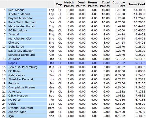 Il Napoli continua la sua scalata nel Ranking Uefa. Gli azzurri di Rafa Benitez occupano la 14esima posizione nella classifica stagionale davanti a squadre come Shaktar, Juventus e Porto. Gli ottimi risultati stagionali mettono il club di De Laurentiis a ridosso delle big europee. L’eventuale passaggio del turno in Champions League porterebbe il Napoli a scalare di fascia nella prossima Champions League, arrivando addirittura alla seconda.